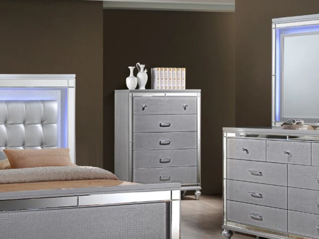 Valentino Silver Upholstered Bedroom Set - You may also be interested in.. W63 x d88 x h62. Louis valentino's avangarde bedroom set. Valentino collection bedroom set, black finish. Contemporary luxury bedroom set with designer long exclusive bed. The silver embossed finish and mirror trim give each piece a glitzy look, while led lighting in the upholstered headboard and dresser mirror of this collection offer a unique feature.